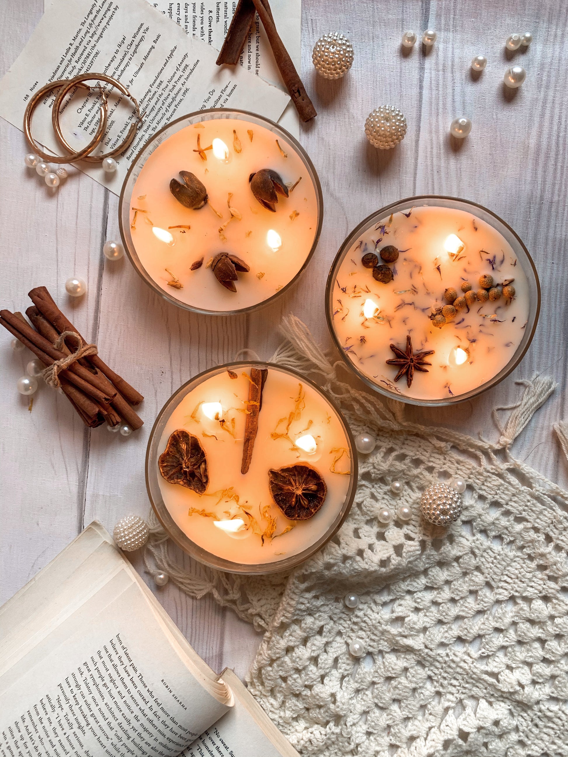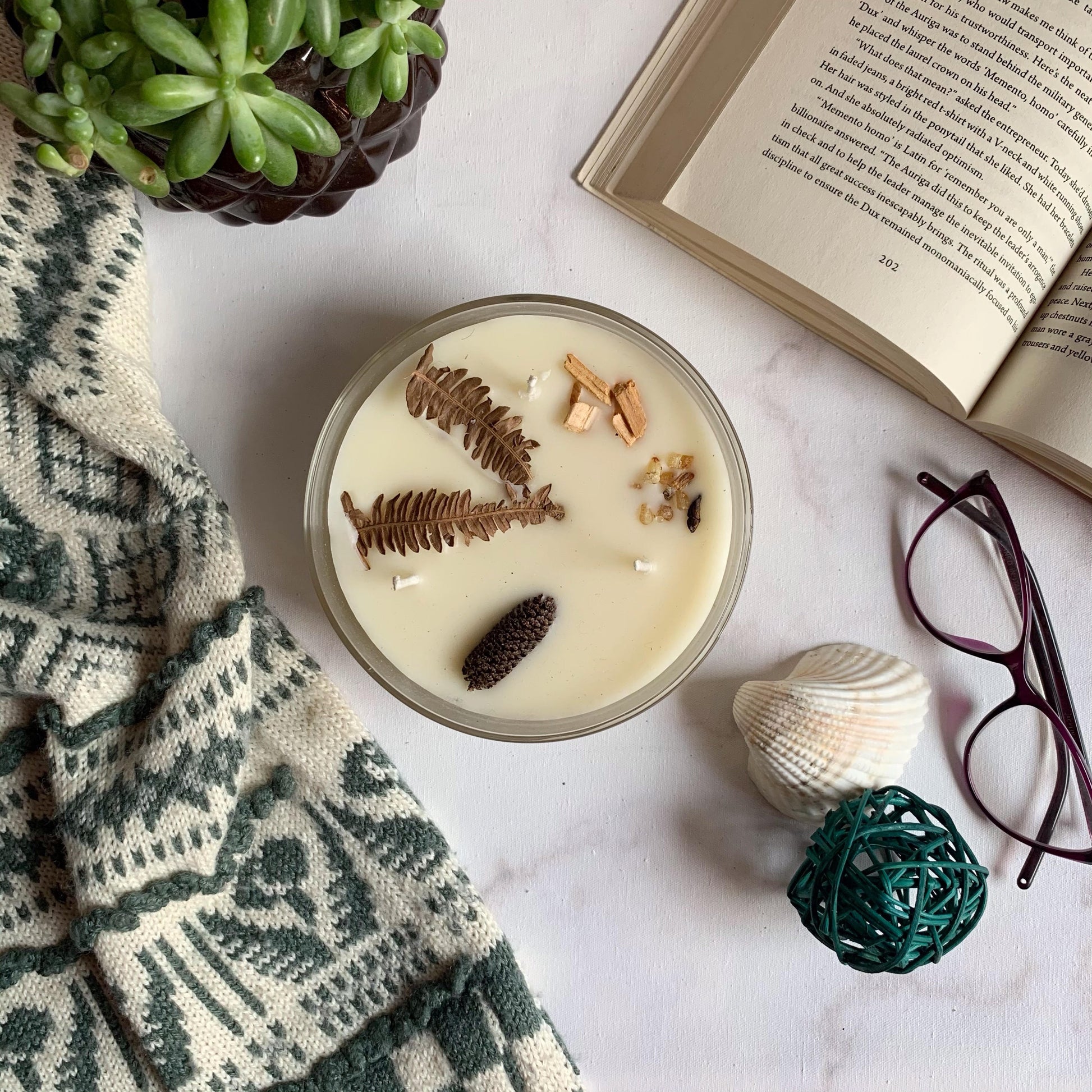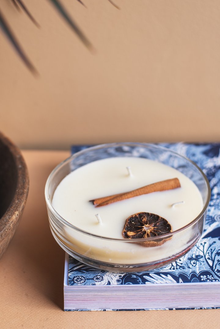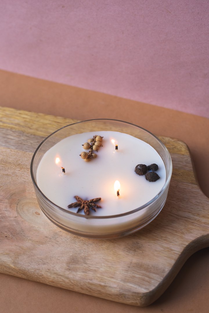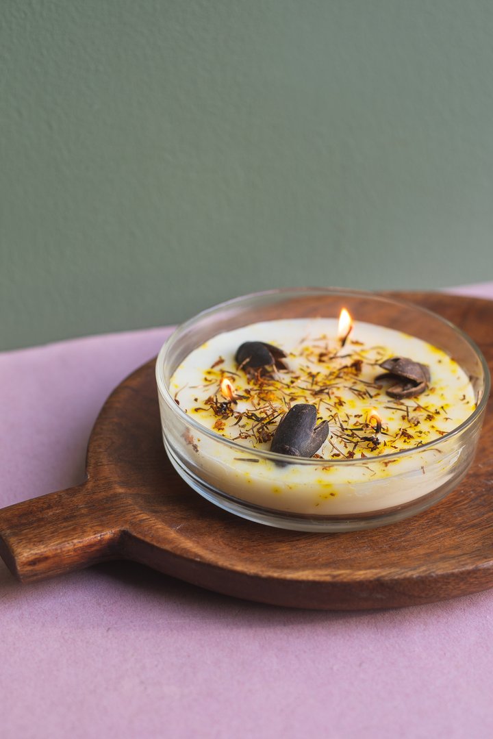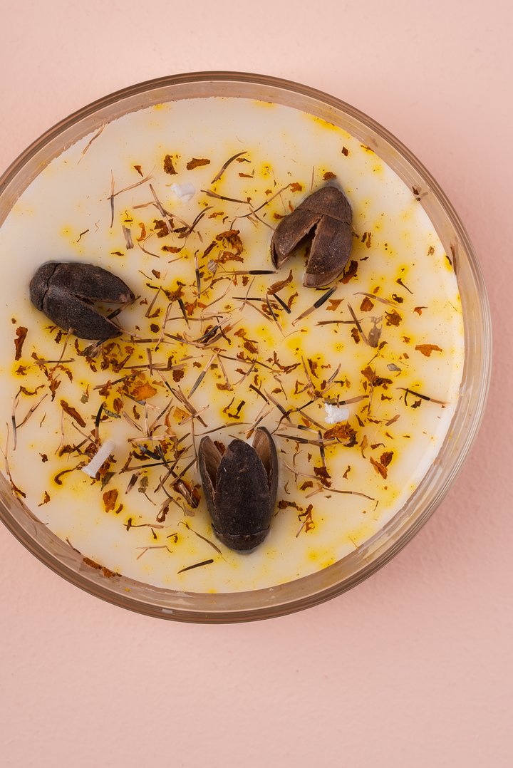 🌿 Topping Botánico: Cada vela tiene una "corona" de ingredientes naturales que la hacen lucir espectacular apagada y liberan su esencia sutil al calentarse la cera.