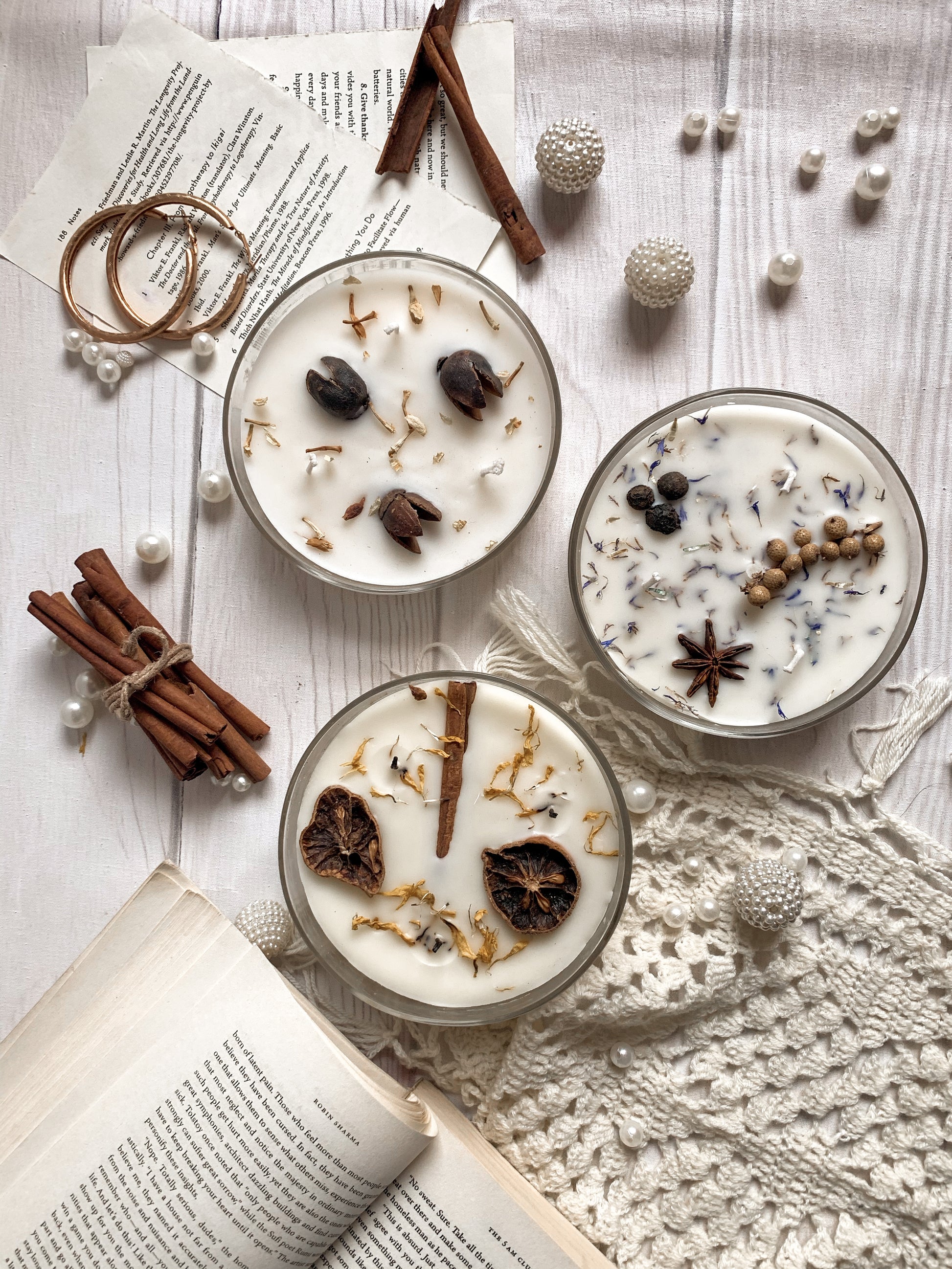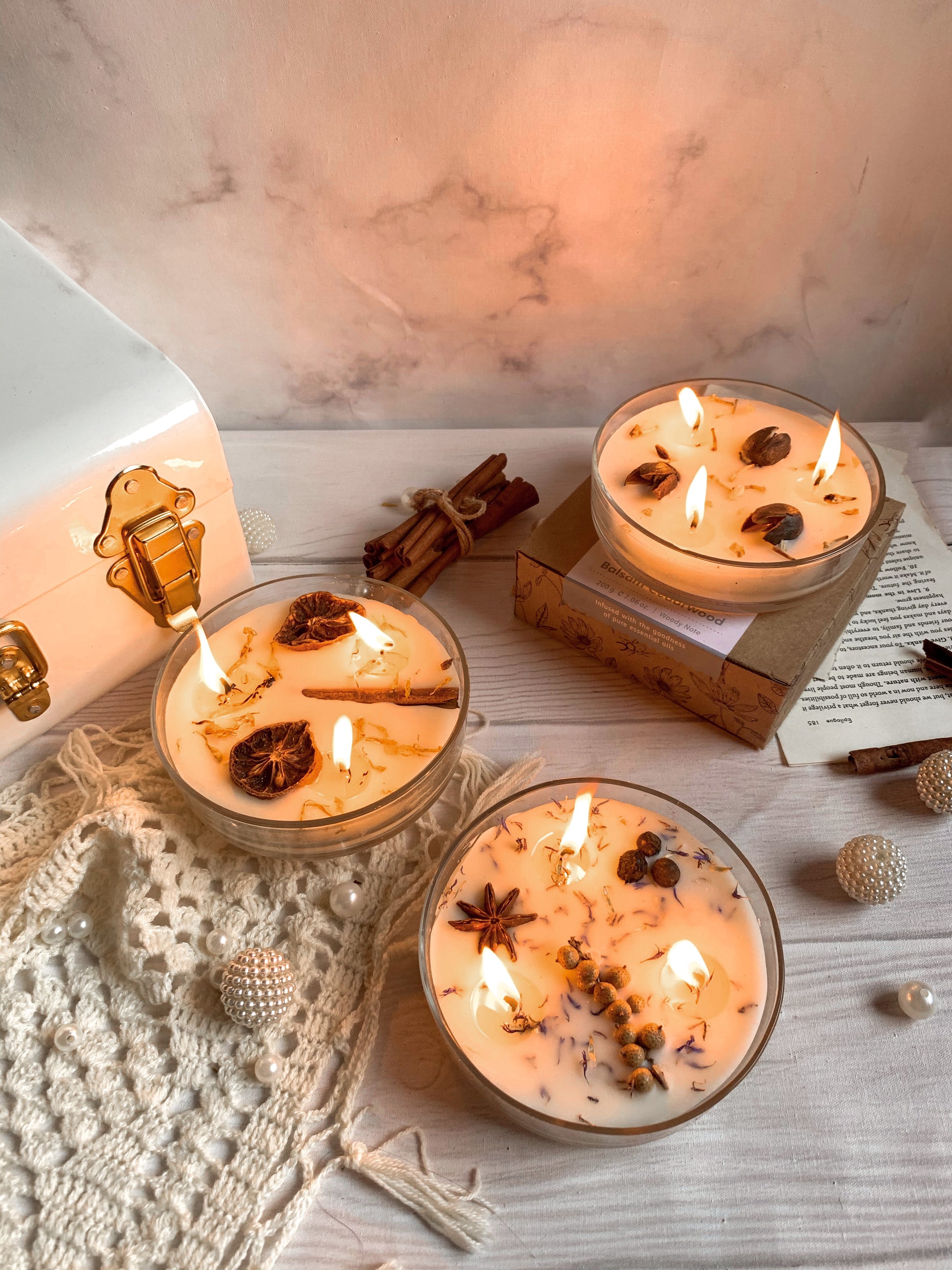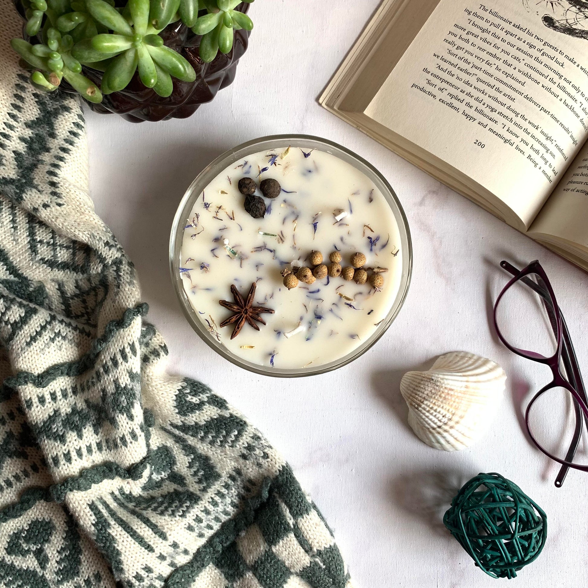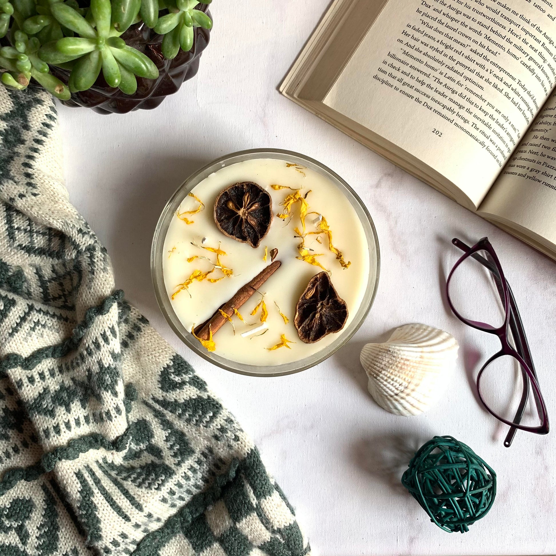🌿 Topping Botánico: Cada vela tiene una "corona" de ingredientes naturales que la hacen lucir espectacular apagada y liberan su esencia sutil al calentarse la cera.